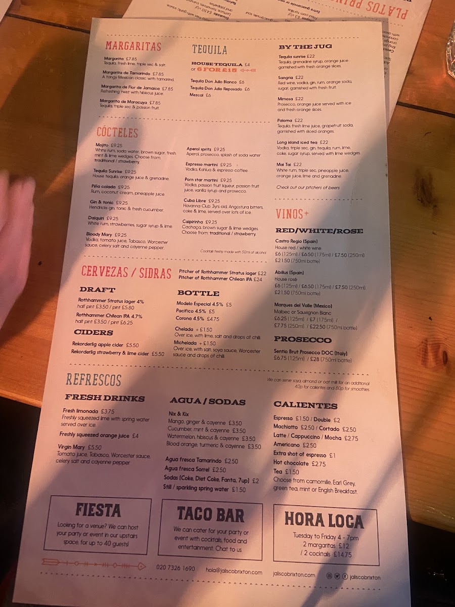 The venue is also a fantastic choice for gatherings, as Fiona Keith illustrated after hosting her birthday party here. With trays of tacos served and an accompanying private bar spiced up with passion fruit margaritas, it's clear that Jalisco Brixton excels not just in individual dining, but also in creating memorable events.